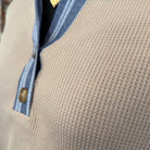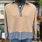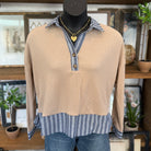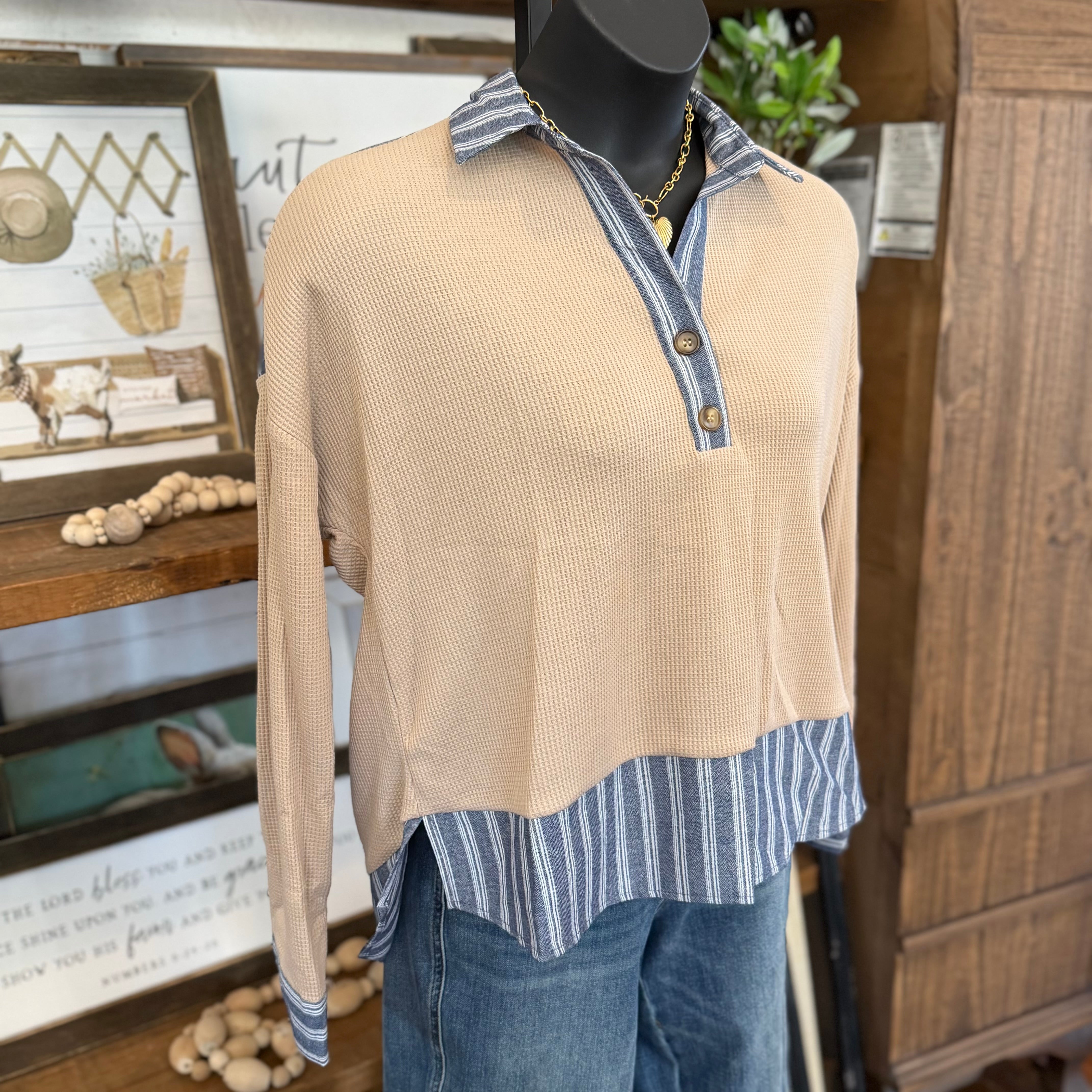 • The Stripped Contrast Trim Waffle Knit Collared Top in Coco is a must-have for any fashion-forward wardrobe
