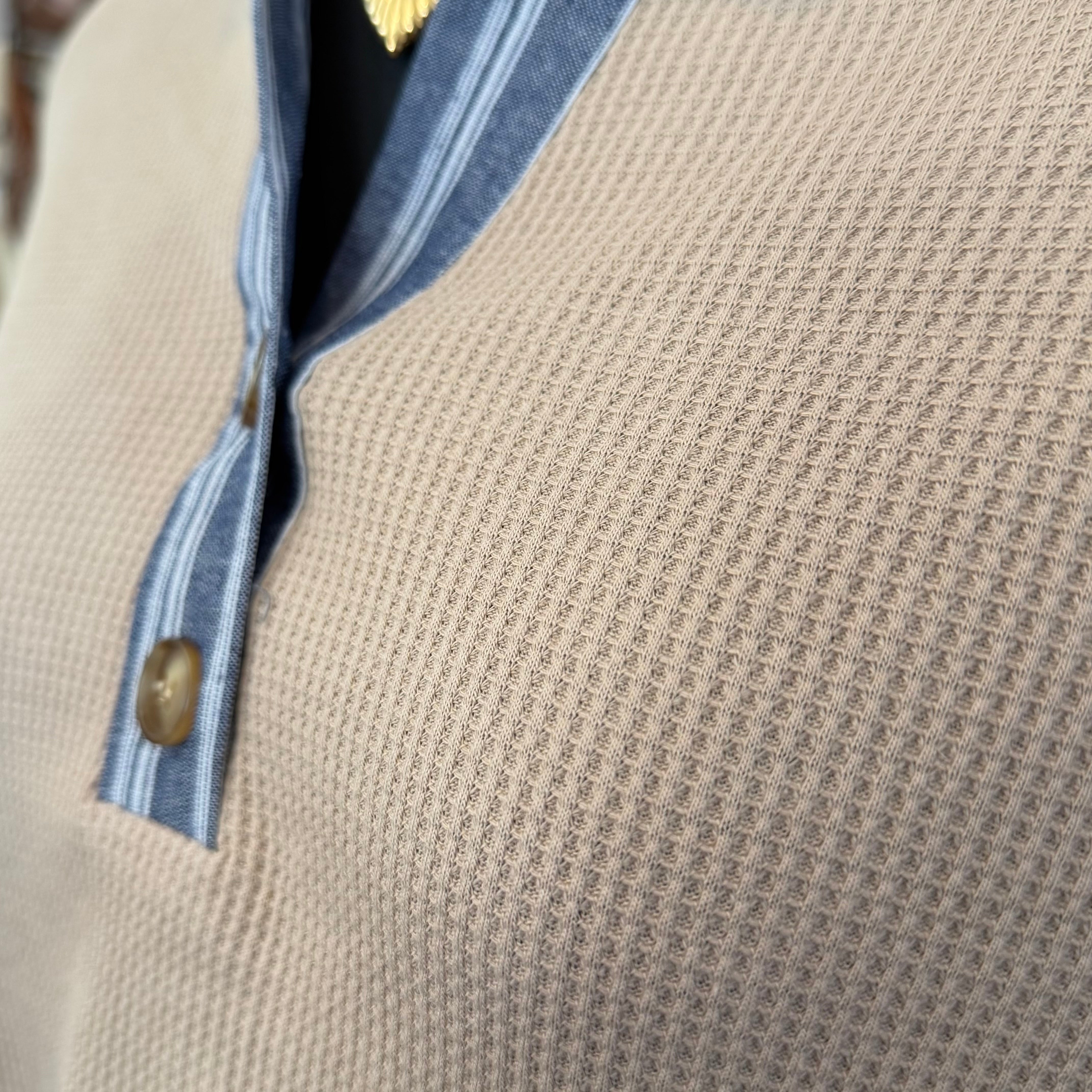 • Its unique waffle knit texture adds visual interest to the classic collared top design