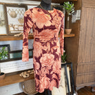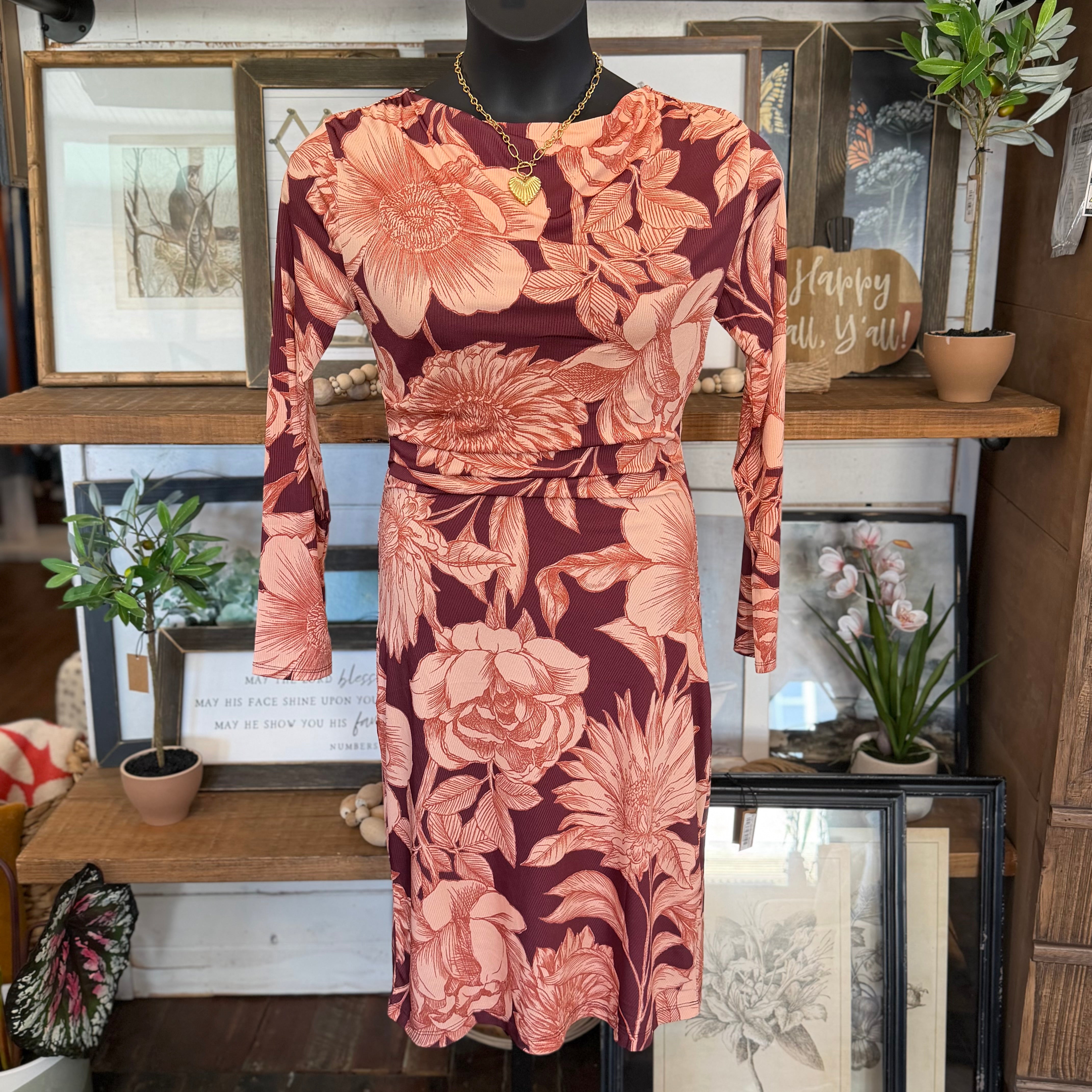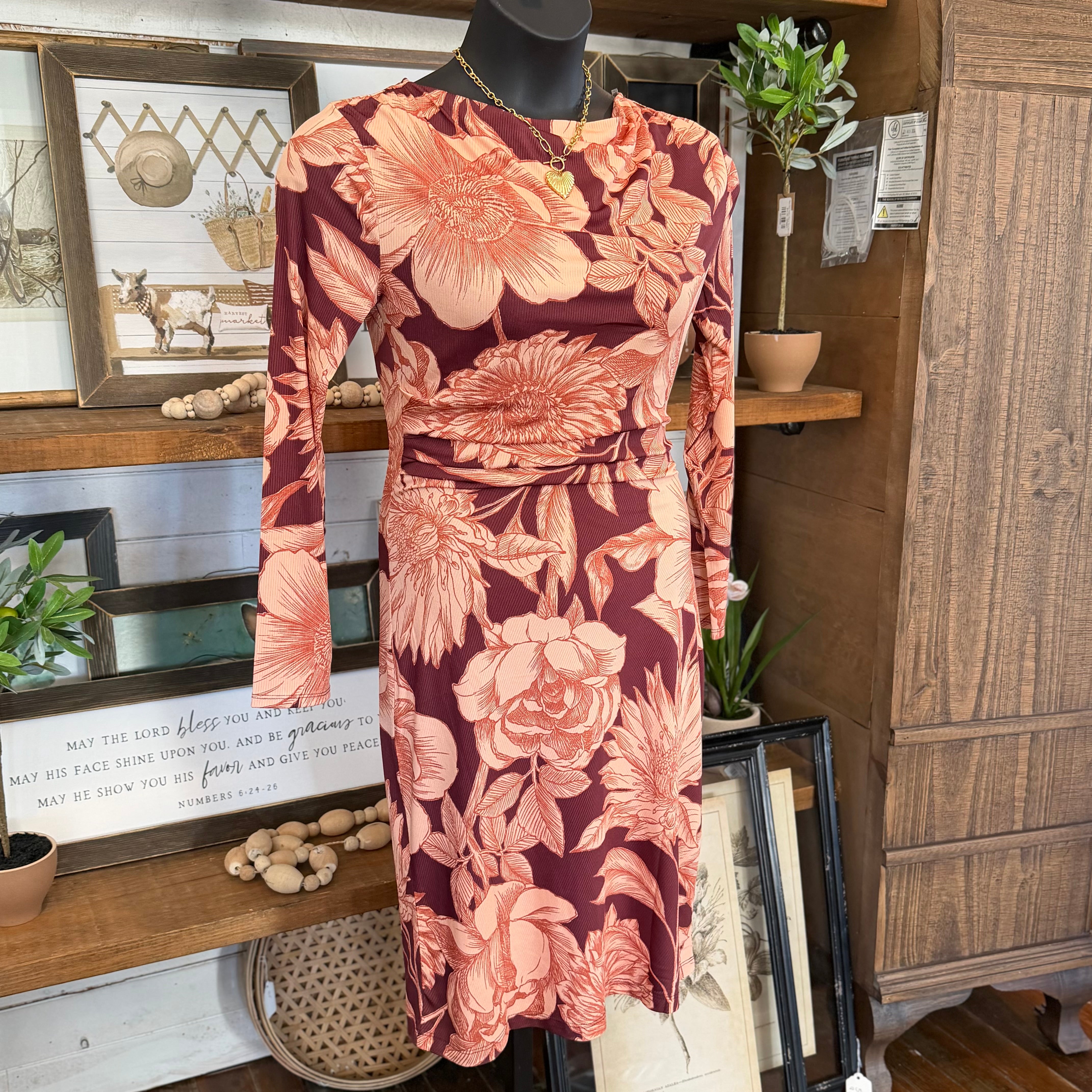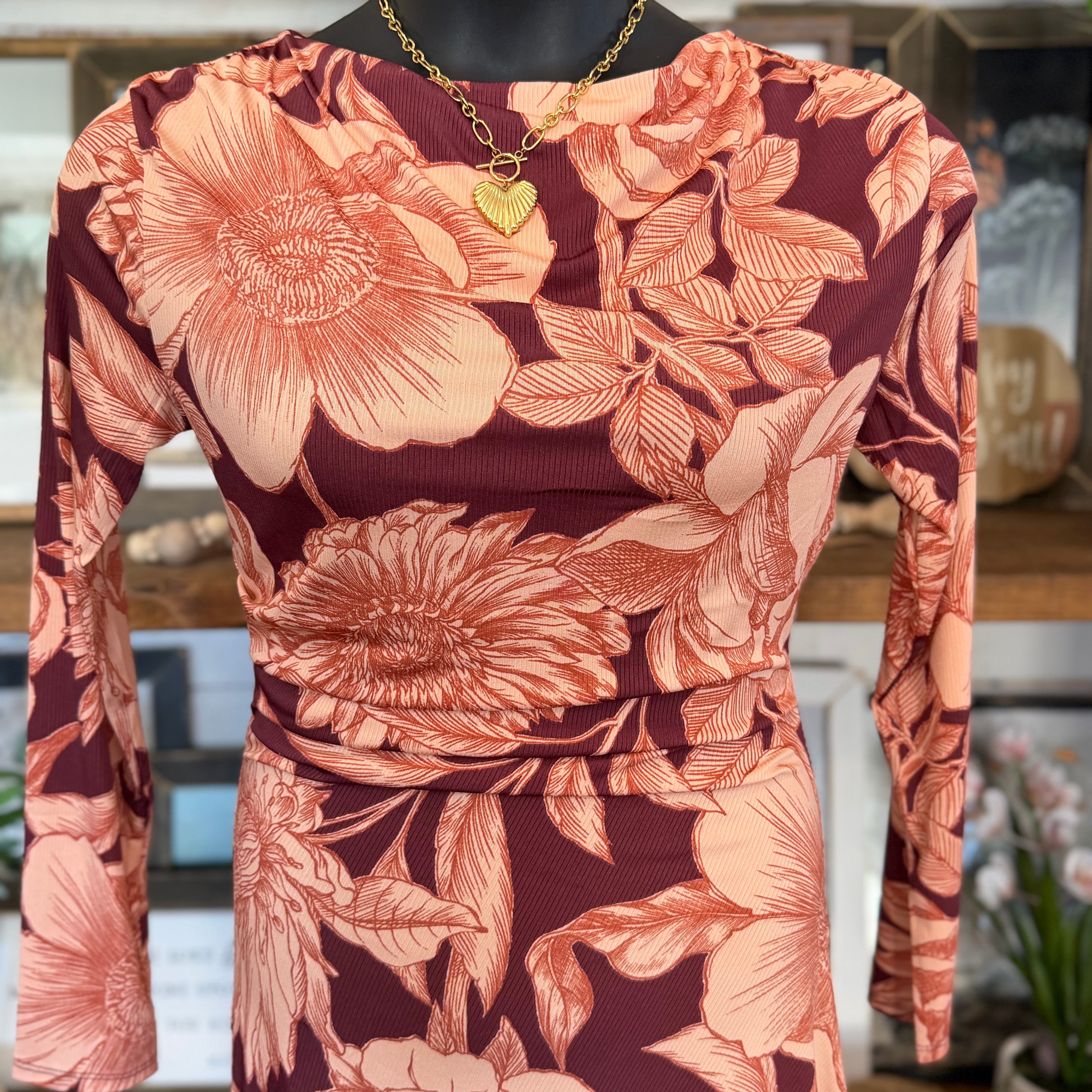 Cowl Neck Long Sleeve Floral Midi Dress | Burgundy Floral
