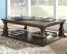 Homey. Hearty. Heavenly hued. Luring with a distressed weathered gray finish and square baluster legs set on a broad lower shelf for great presence, this coffee table is sure to make your homestead feel that much more like home. The look is beautified with elm veneers and a framed and plank-effect tabletop for a richly crafted masterpiece made for years of satisfaction.