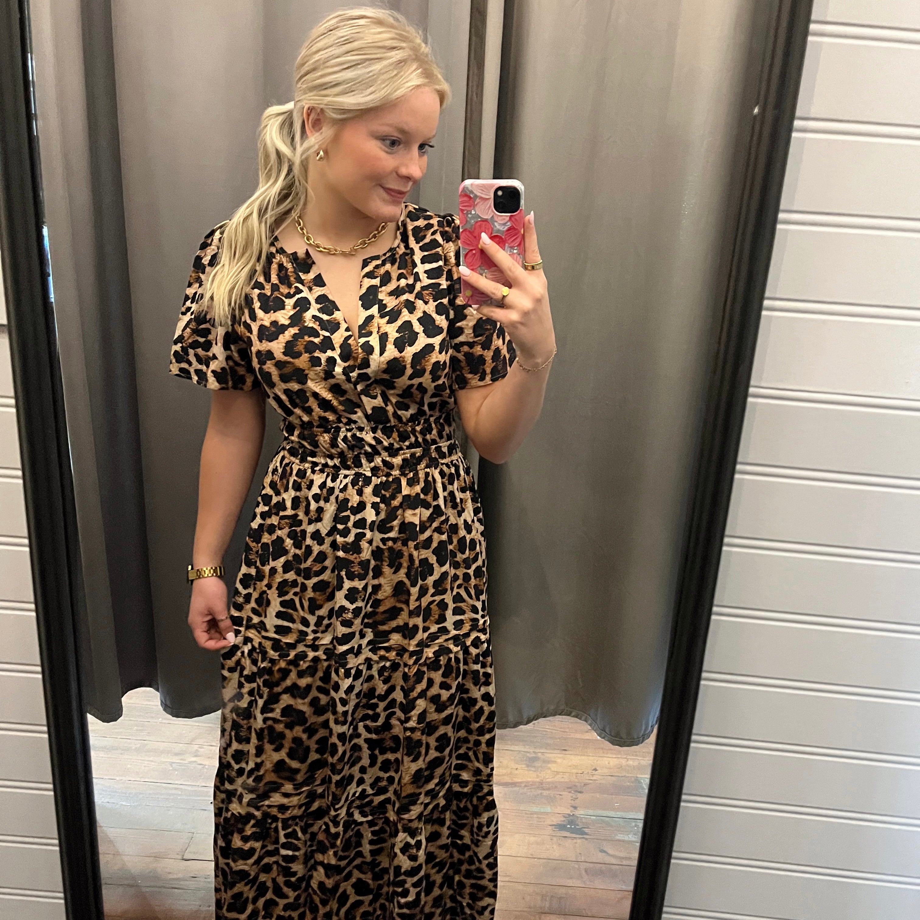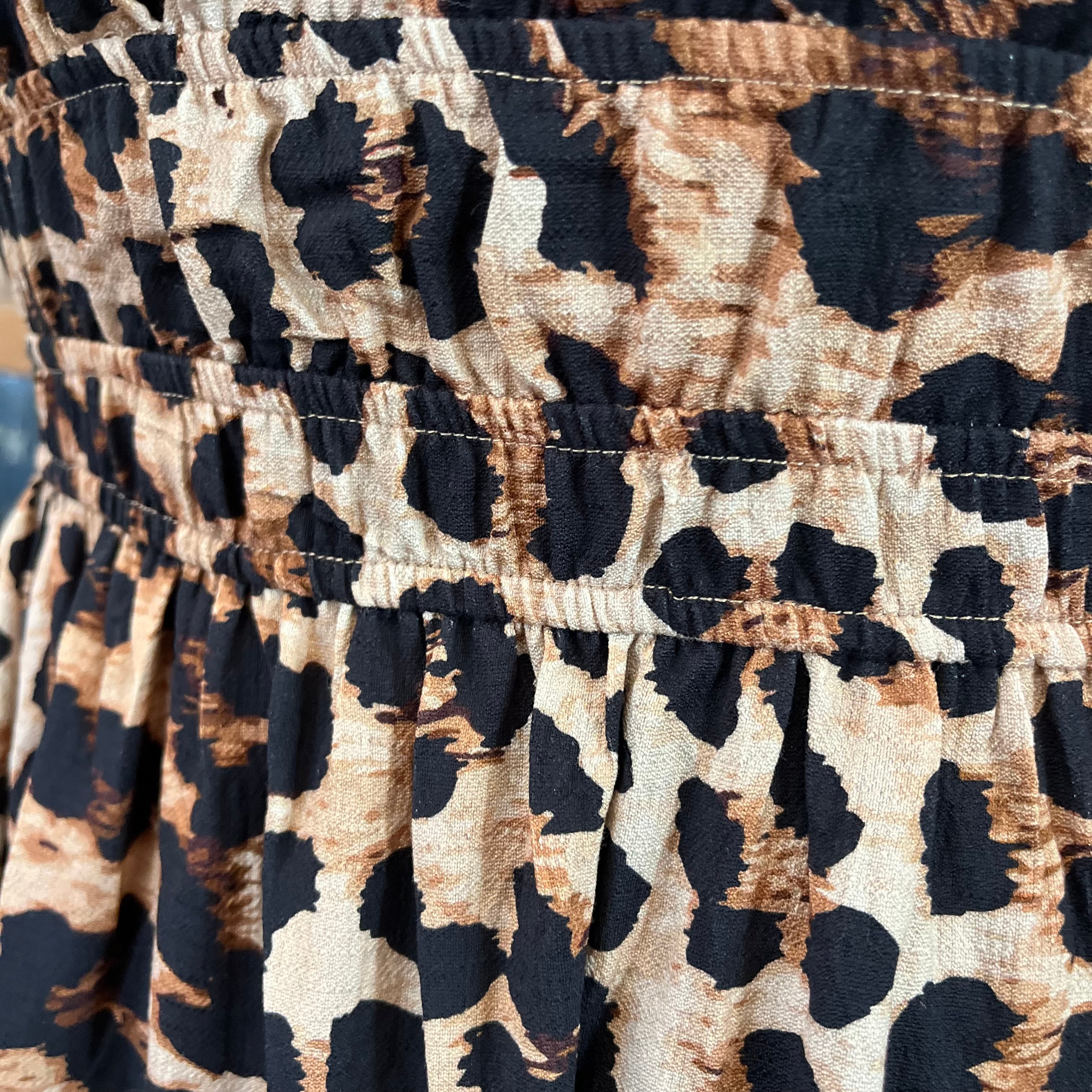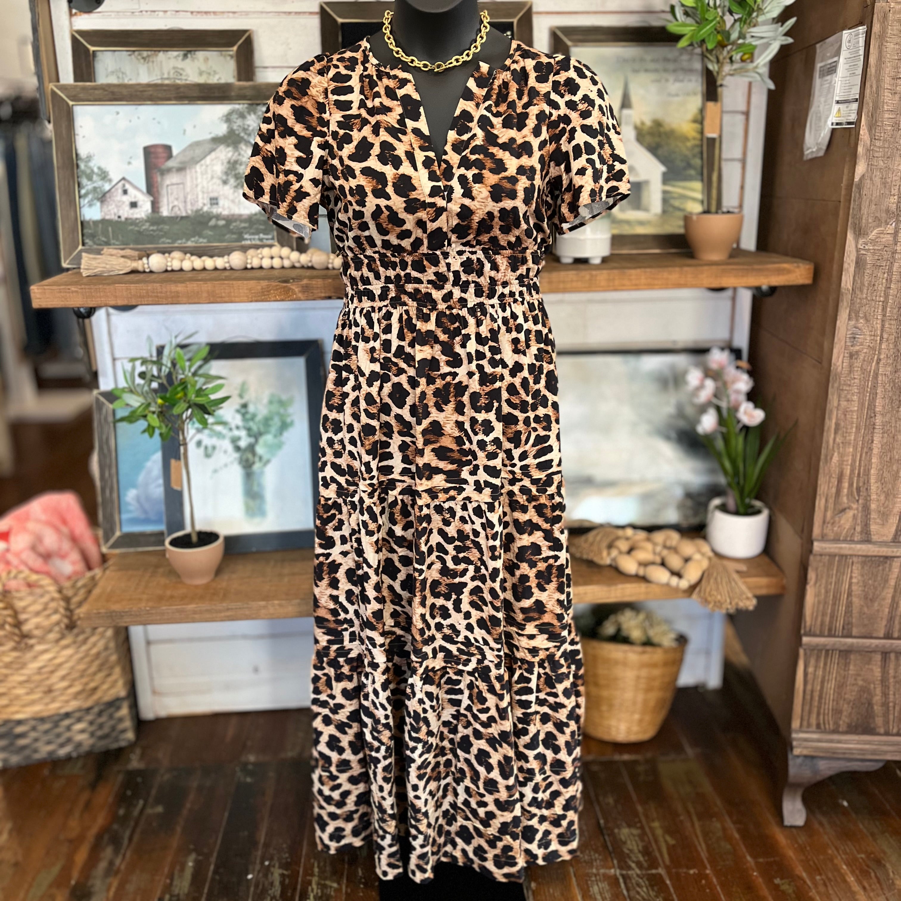 - This versatile leopard printed maxi dress features an elastic waist for comfort and style