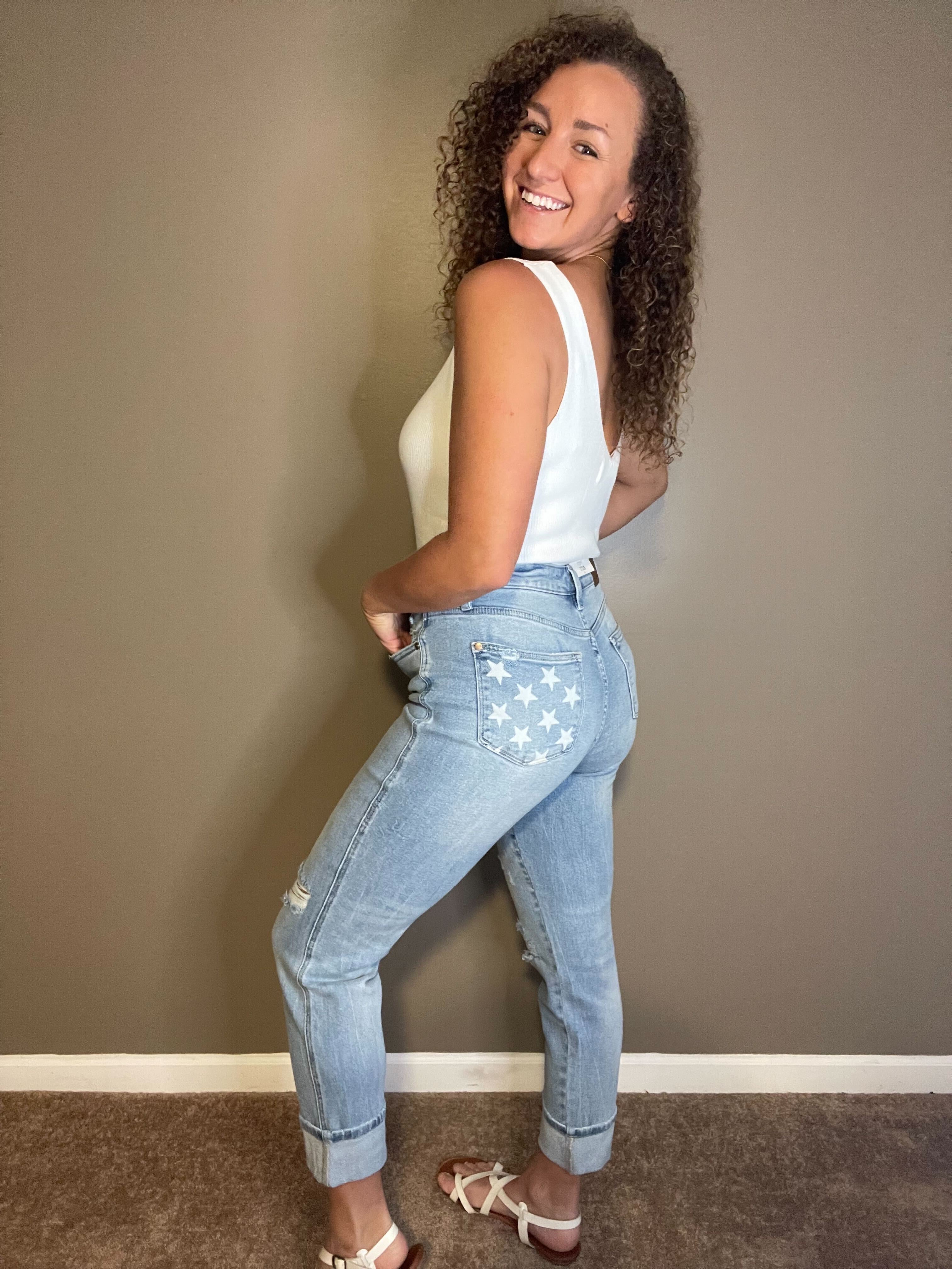 - The boyfriend fit offers a relaxed yet flattering silhouette, and the laser engraved star pattern on the left back pocket will make you the star of the show
