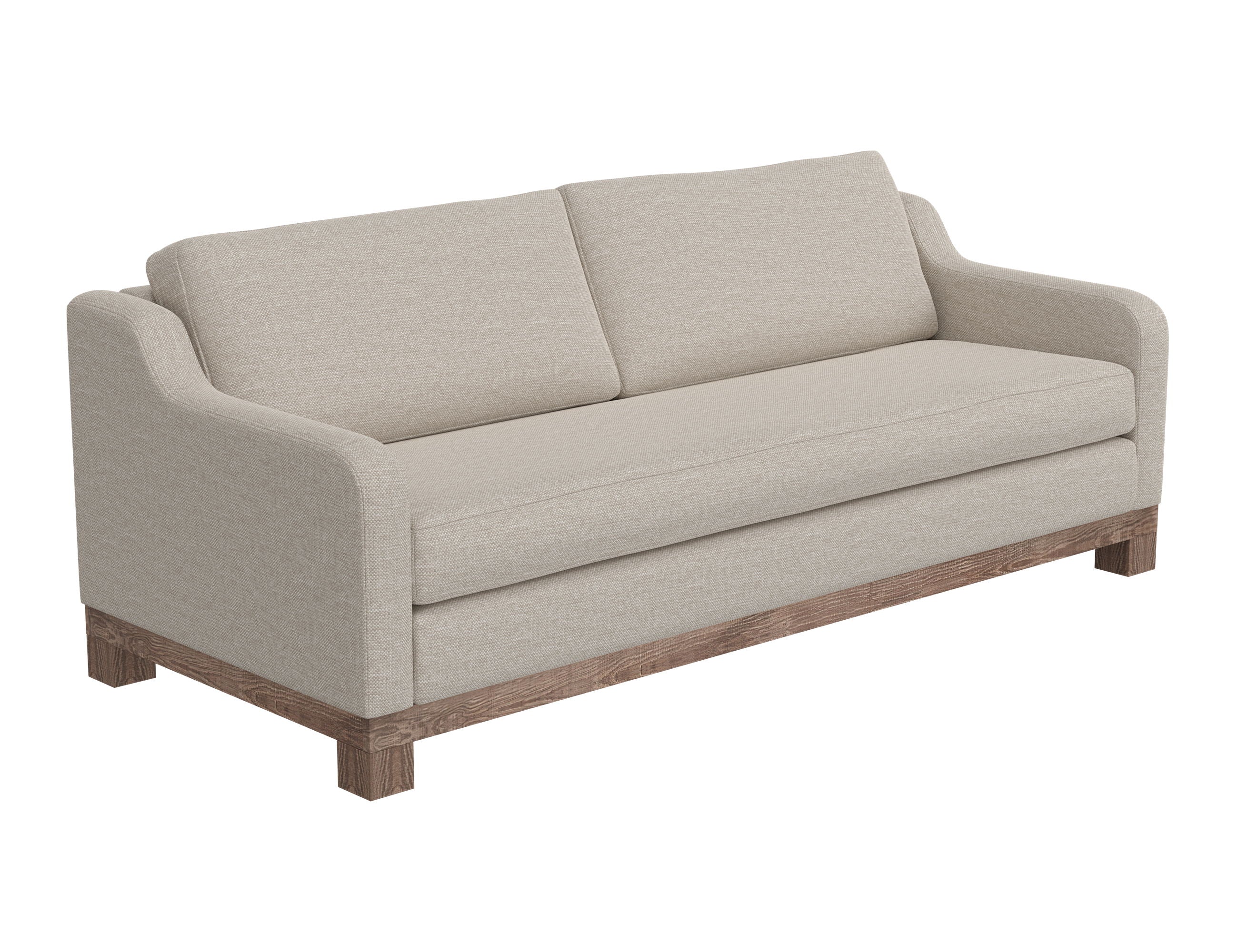 Wooden Frame & Base, Two-Cushion Sofa. With its chunky, wide silhouette, the Samba collection infuses your living room with a touch of traditional charm. Supported by a sturdy frame crafted from solid pine wood, it rests gracefully on low-profile block feet with a rich hue.