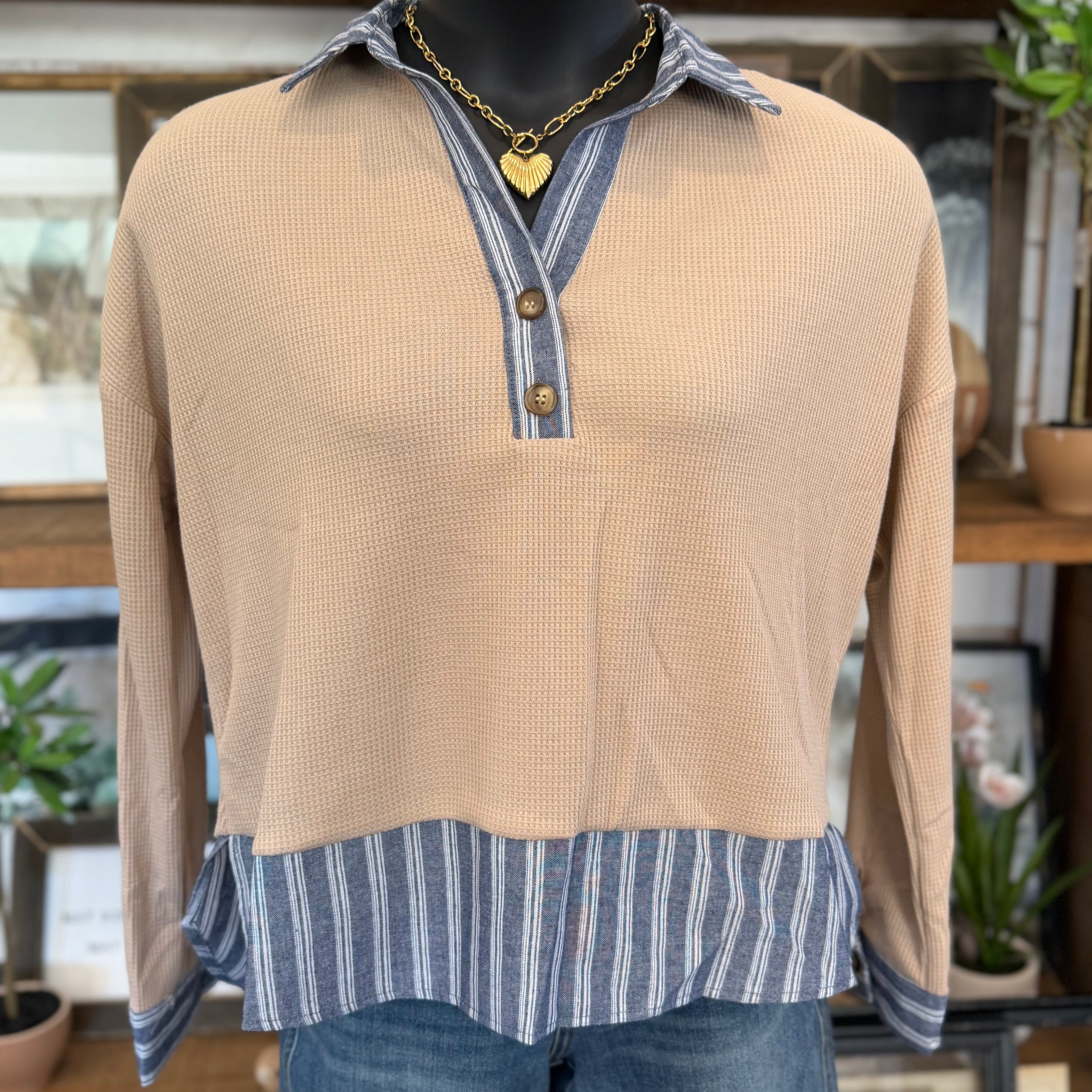 - The Stripped Contrast Trim Waffle Knit Collared Top in Coco is a must-have for any fashion-forward wardrobe